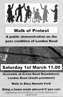 Headington’s LibDem Councillors delivered flyers announcing a “Walk of Protest” on Saturday 1 March to protest about the poor state of the London Road between Headington roundabout and Bury Knowle Park. Protesters are asked to bring their own placards if possible.