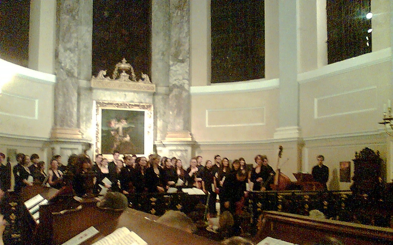 The Queen’s College choir is rated as one of the best in Oxford so a full-scale performance in the College chapel easily got me out in the cold to walk down into the City. With chairs set out on the chapel floor and in the ante-chapel I estimate the audience must have been about 300. Congestion and late arrivals delayed the start of the performance by some 15 minutes to around 7.45. The twenty-eight strong choir was accompanied by the Queen’s Consort (leader Caroline Balding) – strings, oboes (2), trumpets(2), timpani, and harpsichord/organ. Choir and Consort were all under the direction of Owen Rees.