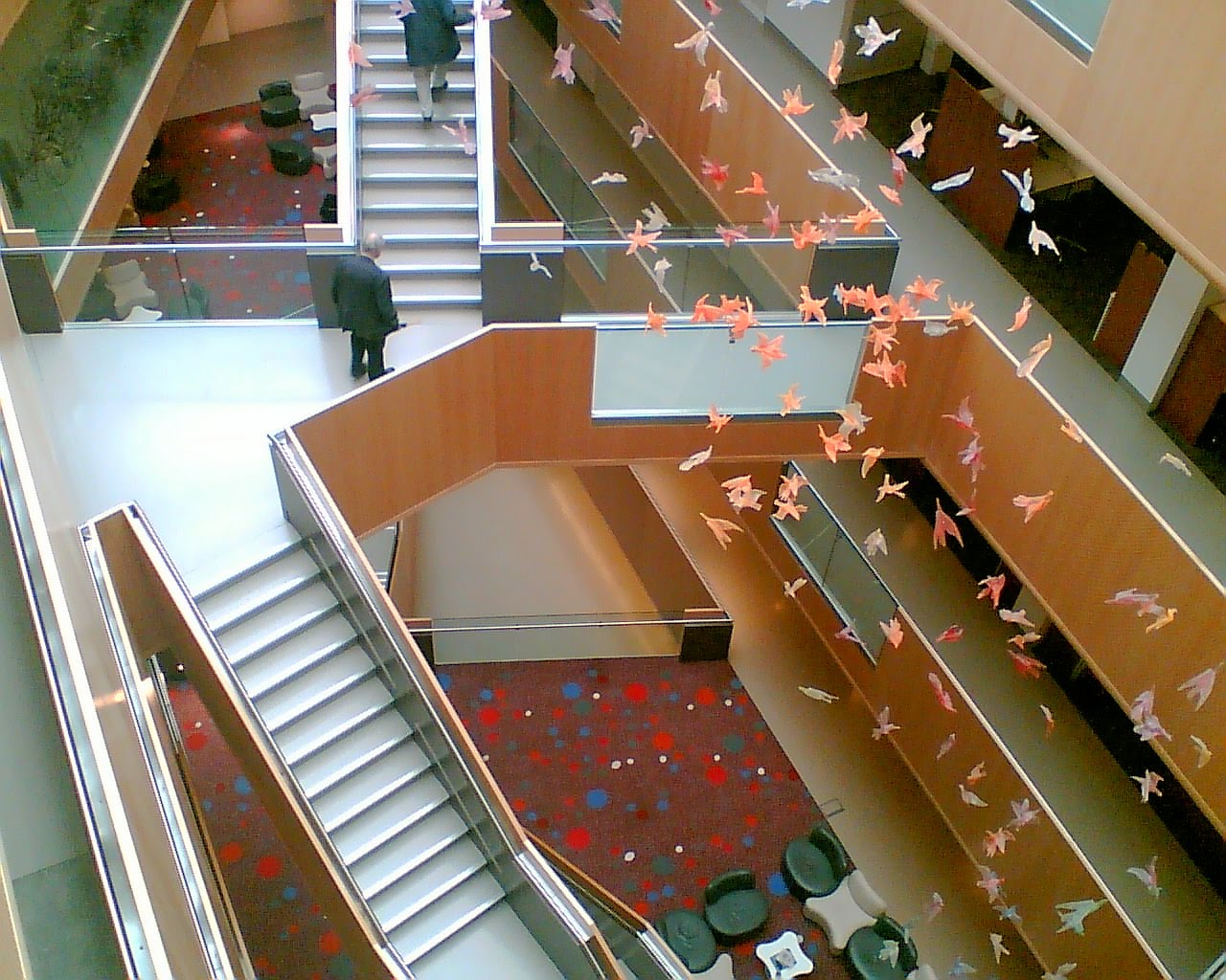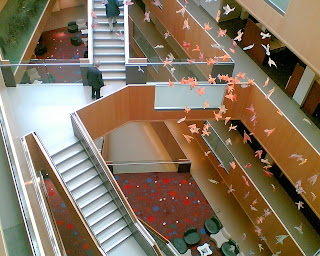 An art programme, "Salt Bridges", makes an important contribution to the creative environment. The birds in the pictures below are part of a structure "Chandelier" by Annie Cottrell which explores the fusion of many parts into one unit. The disc of lights in the first picture is an arrangement of 256 lights whose individual colours vary according to a randomly generated sequence which takes the display from all black to all white over a three hour period. Each black-to-white sequence is different. This work "Light Cycle" is by digital artist Tim Head.
