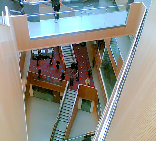 This building, completed in 2008 and known as "New Biochem", won a RIBA award for its architects HawkinsBrown. Built around a full-height atrium the building is designed to encourage mingling and interaction among the researchers who work there. The interior bridges and flying staircases, reminiscent of Escher, are a striking feature. Extensive use of glass and light-coloured wood make the atrium light and bright. The wood cladding also helps quieten the atrium space.