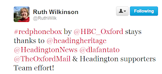 The quickly-mounted camapign to stop BT removing the red phone box in Old Headington has been successful. @RuthWilk, who played a big part herself, paid tribute to the others involved. The story made the Oxford Mail on Wednesday. The start of the story and links to background are in HH 141. Finally, Ruth announced on Friday that BT have agreed to sell the phone box to Headington Action for £1 subject to conditions on its future use which don’t seem to onerous. Ruth’s summary of the campaign and its outcome is here.